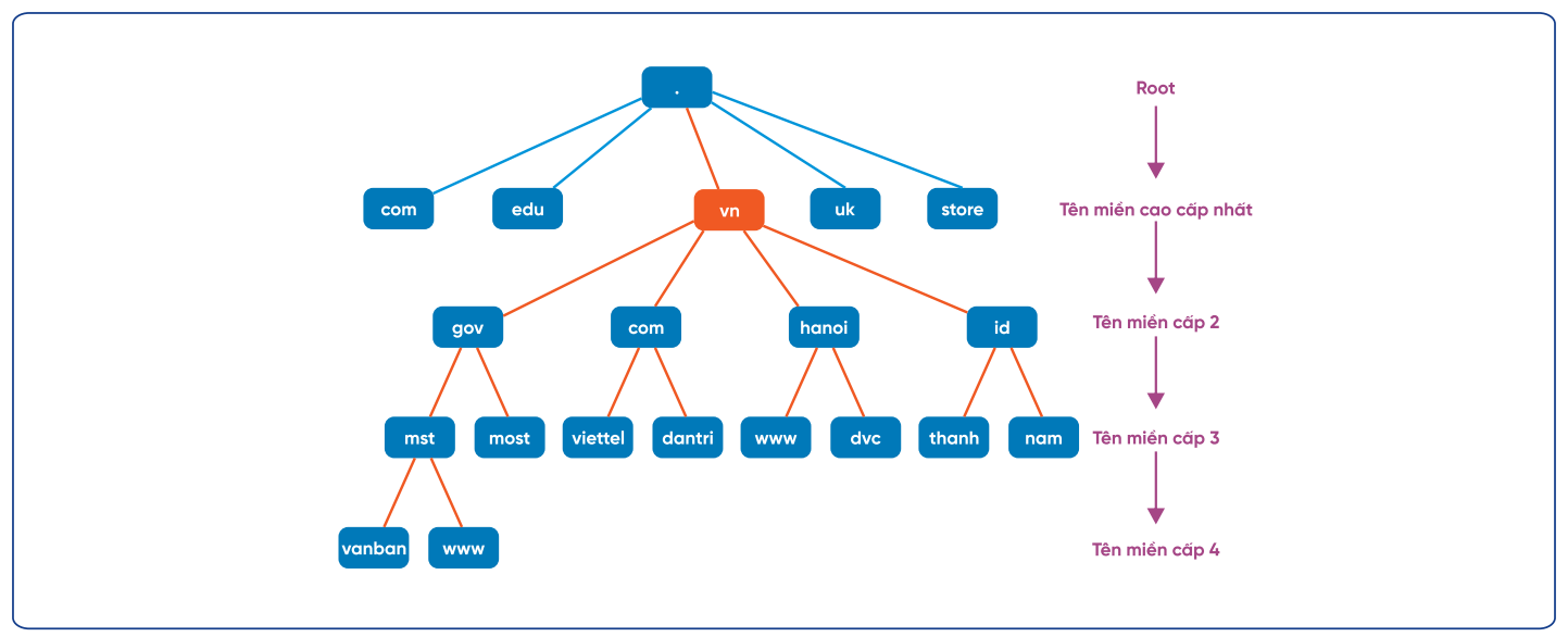 Theo cấu trúc hình cây ở trên, tên miền được phân thành các cấp độ: