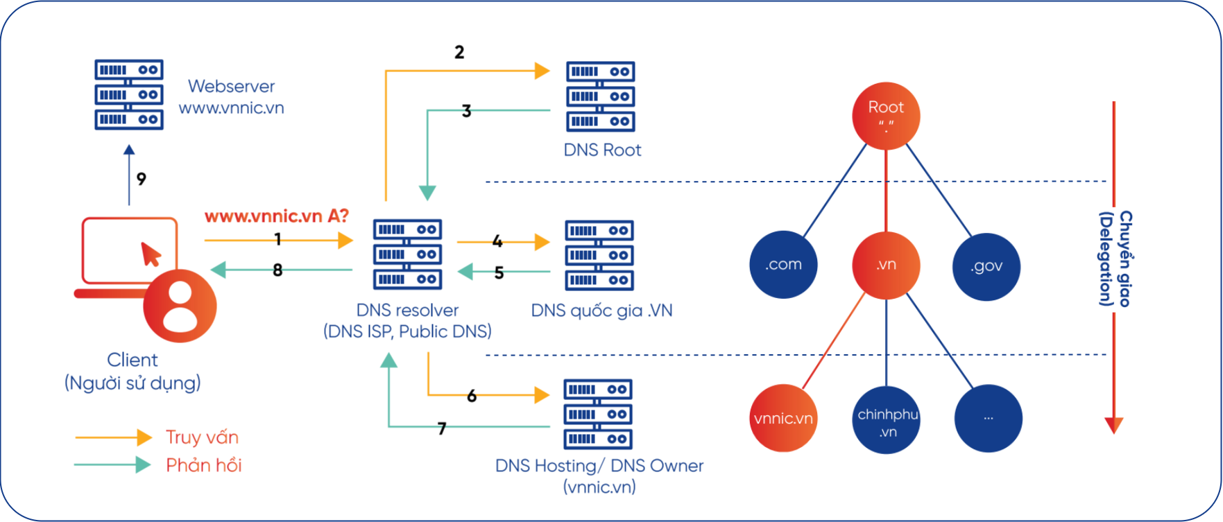 • Bước 5: Hệ thống máy chủ tên miền quốc gia Việt Nam lưu trữ thông tin chuyển giao của toàn bộ tên miền ".vn", do đó sẽ gửi phản hồi lại máy chủ DNS resolver thông tin các máy chủ DNS chuyển giao (DNS Authoritative) của tên miền vnnic.vn (bao gồm địa chỉ IP và tên máy chủ).
