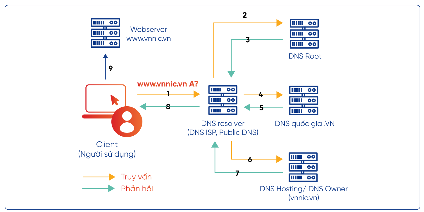 Chức năng chính của hệ thống máy chủ DNS là cung cấp dịch vụ phân giải tên miền (name resolution). Khi một người dùng nhập tên miền vào trình duyệt, chẳng hạn như www.vnnic.vn, máy chủ DNS sẽ chuyển đổi tên miền này thành địa chỉ IP tương ứng, giúp thiết bị truy cập đến dịch vụ mong muốn. Quá trình này diễn ra thông qua một chuỗi các truy vấn, được xử lý thông qua các máy chủ DNS ở các cấp khác nhau.