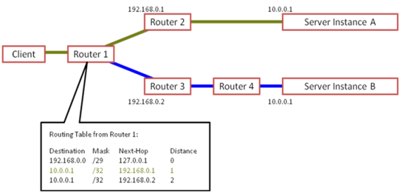 Router1 treats 10.0.0.1 as a single instance