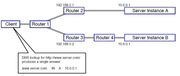 Two server instances A and B share the same Anycast IP address: 10.0.0.1