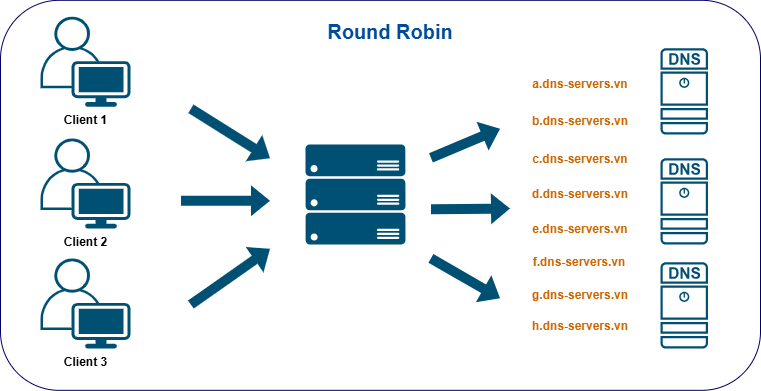 Đây gọi là thuật toán luân chuyển vòng, các máy chủ sẽ được xem ngang hàng và sắp xếp theo một vòng quay. Các truy vấn dịch vụ sẽ lần lượt được gửi tới các máy chủ theo thứ tự sắp xếp.