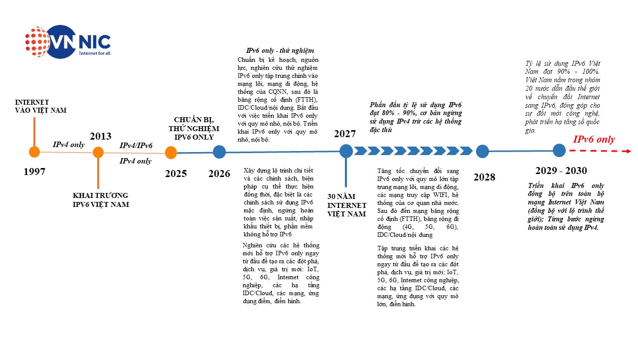 Theo Chương trình mới, lộ trình chuyển đổi được đẩy nhanh 02 năm, đặt mục tiêu năm 2030 tỷ lệ sử dụng IPv6 Việt Nam đạt mức 90%-100%, tắt dần IPv4. Việt Nam nằm trong nhóm 10-20 nước dẫn đầu thế giới về chuyển đổi Internet sang IPv6, triển khai IPv6 only, đóng góp cho sự đổi mới, sáng tạo, phát triển hạ tầng số, phát triển dịch vụ mới với chất lượng cao (5G, 6G, Cloud, AI,…).