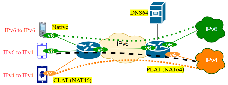 Tuy nhiên, vấn đề của DNS64/NAT64 là các ứng dụng sử dụng địa chỉ IPv4 literal (sử dụng IPv4 trực tiếp thay vì tên miền, ví dụ Ping 8.8.8.8), hoặc các ứng dụng chưa hỗ trợ IPv6 sẽ không thể hoạt động. Chính vì vậy, giải pháp 464XLAT được đề xuất và trở thành tiêu chuẩn trong mạng di động, nơi quá trình chuyển đổi IPv6 Only đã diễn ra mạnh mẽ.