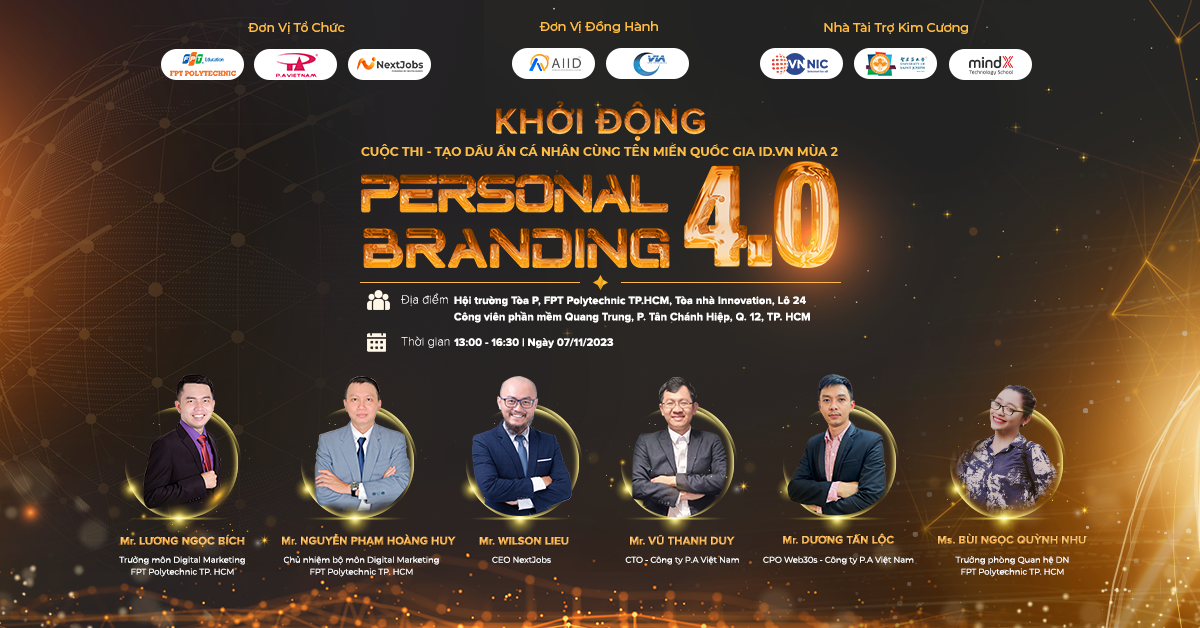 Nhằm lan tỏa chương trình Định danh gương mặt số và ứng dụng thực tiễn tên miền quốc gia ID.VN trong các hoạt động học tập, trải  nghiệm của giới trẻ (đặc biệt là sinh viên),  Cuộc thi “Personal Branding 4.0” mùa 2 đã chính thức được khởi động. Cuộc thi này được tổ chức bởi NextJobs và P.A Việt Nam (Nhà đăng ký tên miền “.vn”) phối hợp cùng FPT Polytechnic TP. HCM, cùng với sự đồng hành  của Trung tâm Internet Việt Nam (VNNIC) và Hiệp hội Internet Việt Nam (VIA) hứa hẹn thu hút nhiều nhân tố sáng giá xây dựng thành công thương hiệu trực tuyến với trang web cá nhân sử dụng tên miền quốc gia ID.VN.
