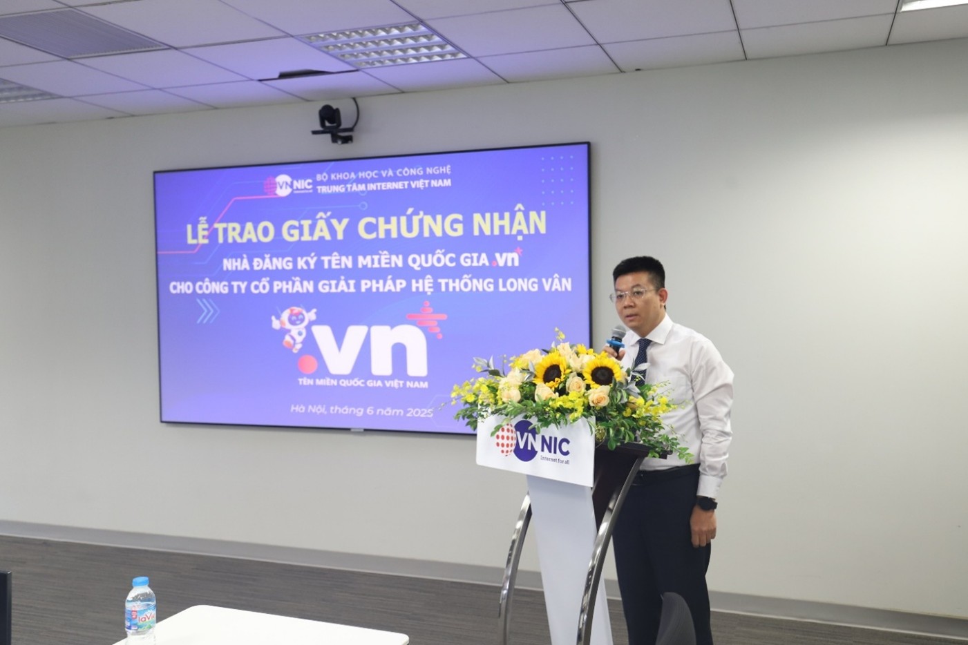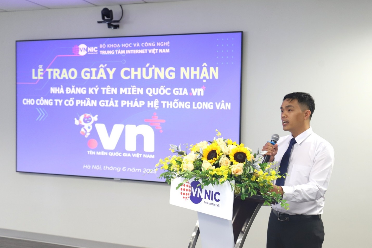 Ông Nguyễn Hồng Thắng – Giám đốc VNNIC phát biểu tại buổi Lễ trao Giấy Giấy chứng nhận NĐK tên miền quốc gia “.vn” cho Công ty Cổ phần Giải pháp Hệ thống Long Vân